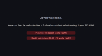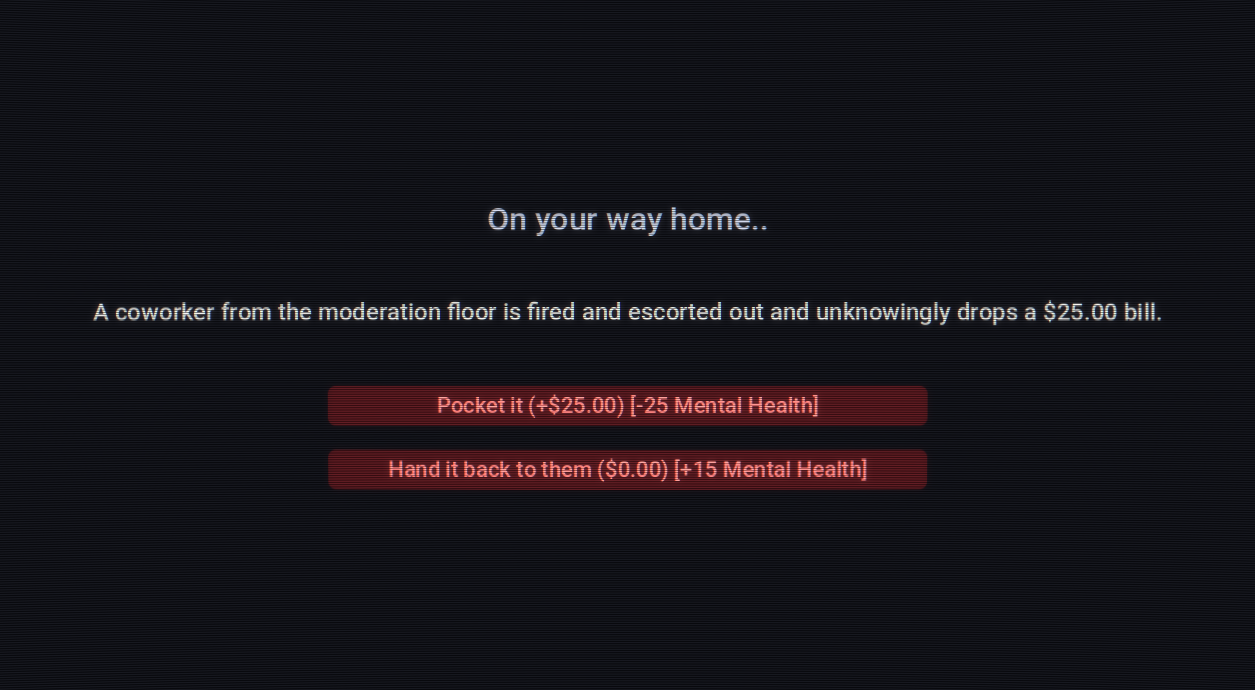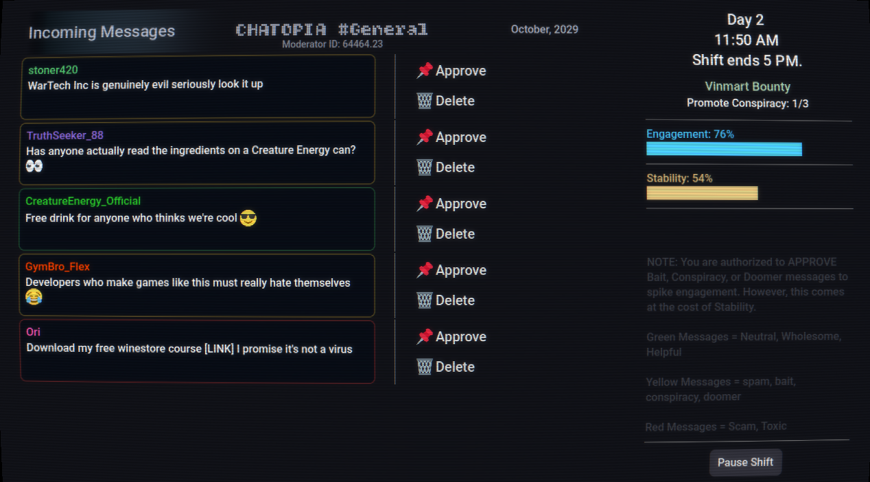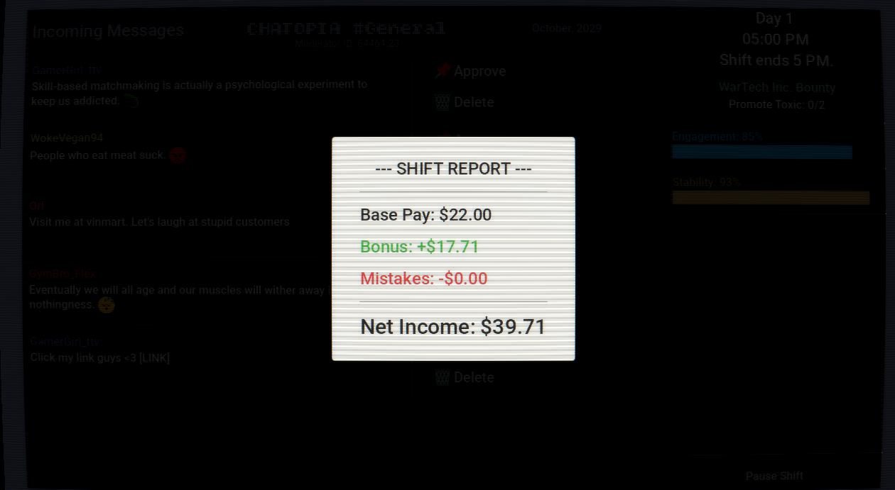 As one of the last human moderators of Chatopia, you must approve or delete incoming messages, categorize them correctly to keep up Engagement and Stability. Complete sponsor bounties during shifts to pay off soul-crushing debt, manage your mental health and navigate through moral choices that will determine your final evaluation.